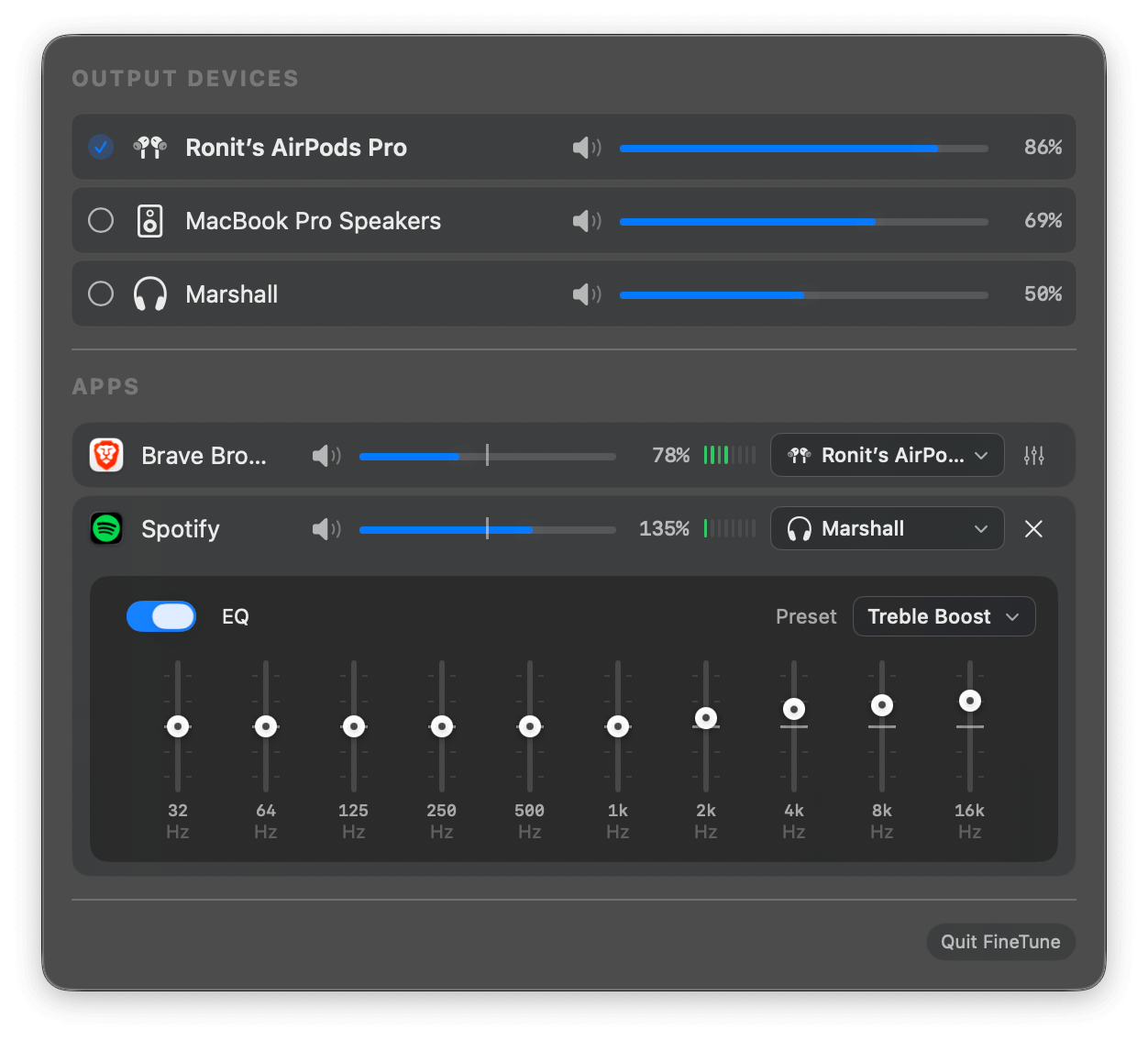 FineTune uses macOS Core Audio process taps to intercept and modify audio streams before they reach your output devices. This allows precise control without affecting the source applications.