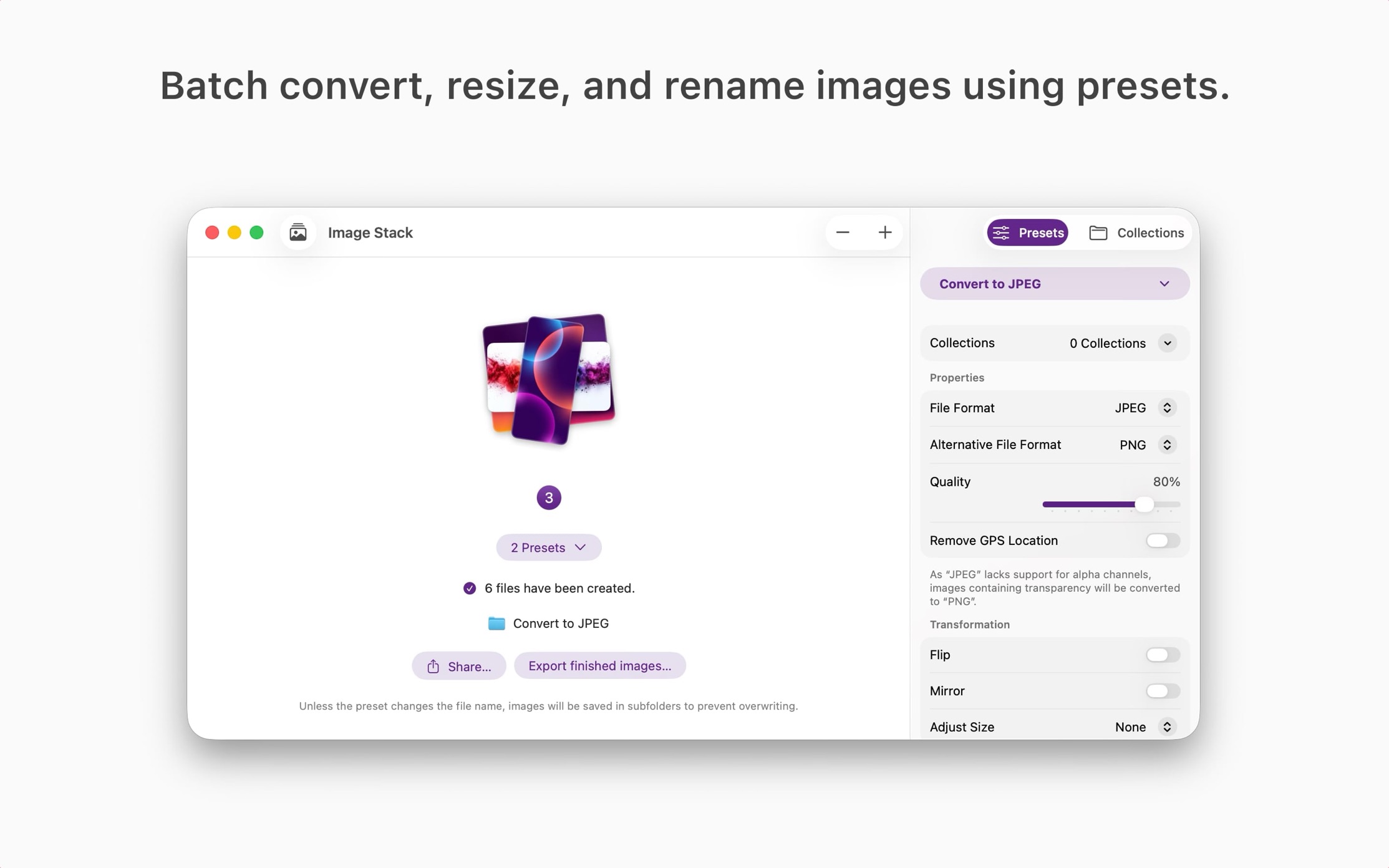 Batch convert, resize, rename. Image Stack converts images using presets to change formats, resize, rename, and more. Whether you’re processing a single image or a stack of thousands, Image Stack keeps your workflow fast, consistent, and effortless.