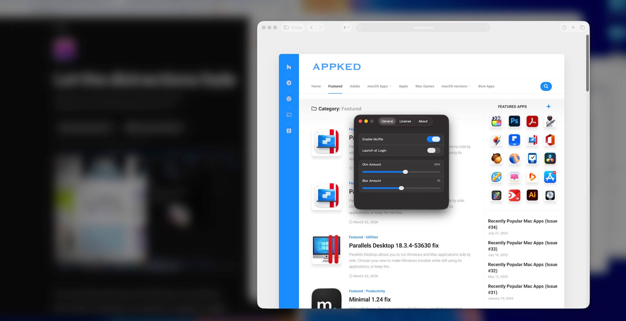 Muffle is a lightweight macOS utility designed to enhance your productivity by reducing visual distractions. It automatically blurs and dims all background windows, keeping your active window clear and in focus.