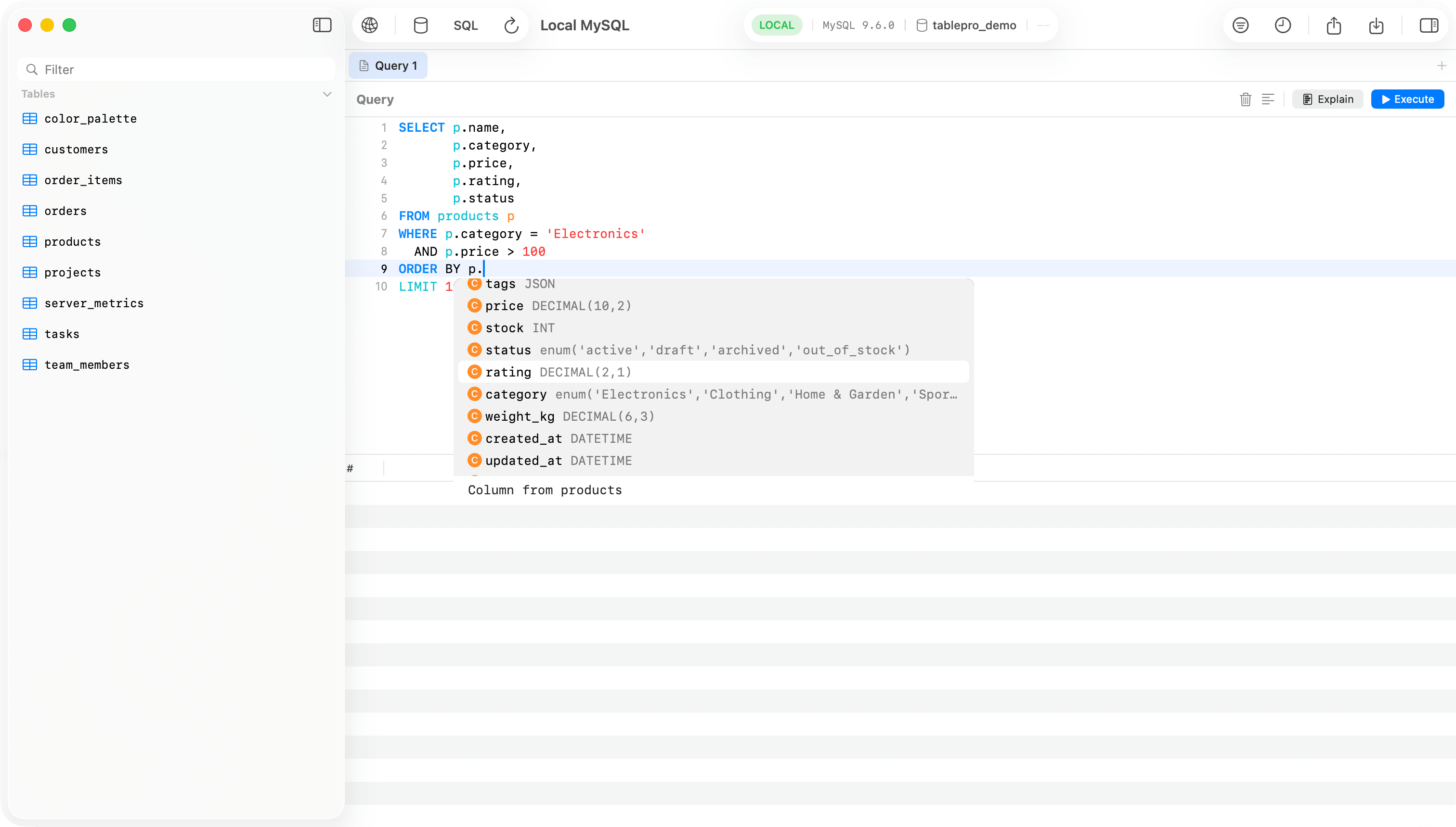 With a focus on performance and usability, TablePro offers a powerful SQL editor, an intuitive data grid, and secure connection options, making it suitable for both everyday queries and complex database workflows.